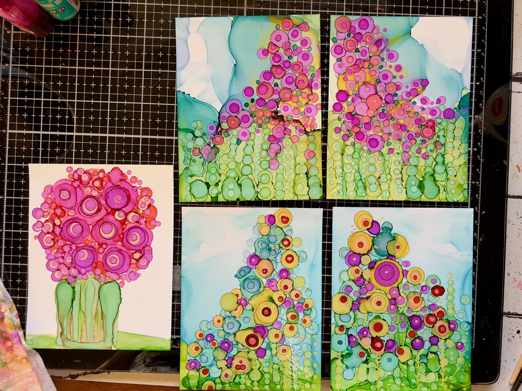 Samples of cards made using the alcohol ink flower garden technique taught in my on-line class.