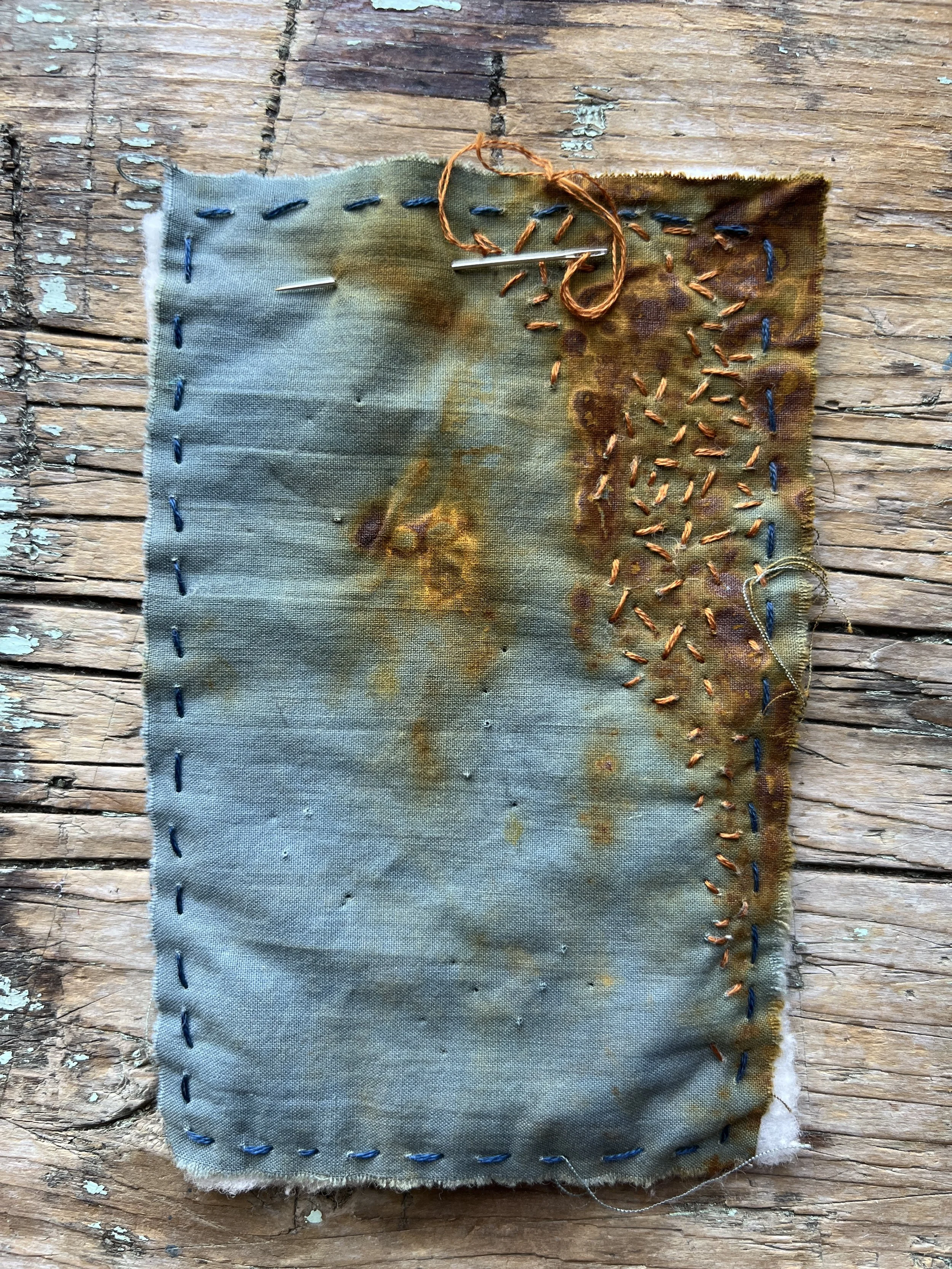 • Fabric bases: I pre-cut a stack of 3x5 inch rectangles from my hand-dyed indigo fabric. This fabric went through a rusting process, so it has random rusty patches—like little sparks of imagination already waiting for me.